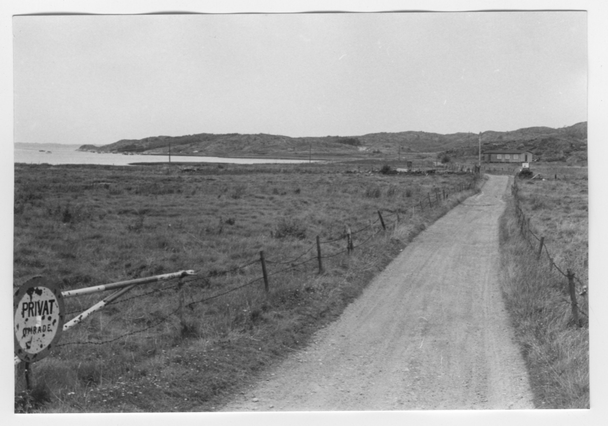 'Bildtext: ''Strandäng. Riktning 290.'' Vy över strandäng ner mot havet. Grusväg med skylt ''Privat område'', rakt fram hus och i bakgrunden berghällar. Taggtrådsstaket längs grusväg. :: :: Ingår i serie med fotonr. 6970:1-1125, dokumentation av Hisingens naturgeografi, visande landskapsformerna i stora drag och gjord inför exploateringen av området. Platserna för fotograferingen finns utsatta på karta i skala 1:4000 som finns på Göteborgs Naturhistoriska musem. Fotoriktningen mättes med kompass i gammalgrader.'