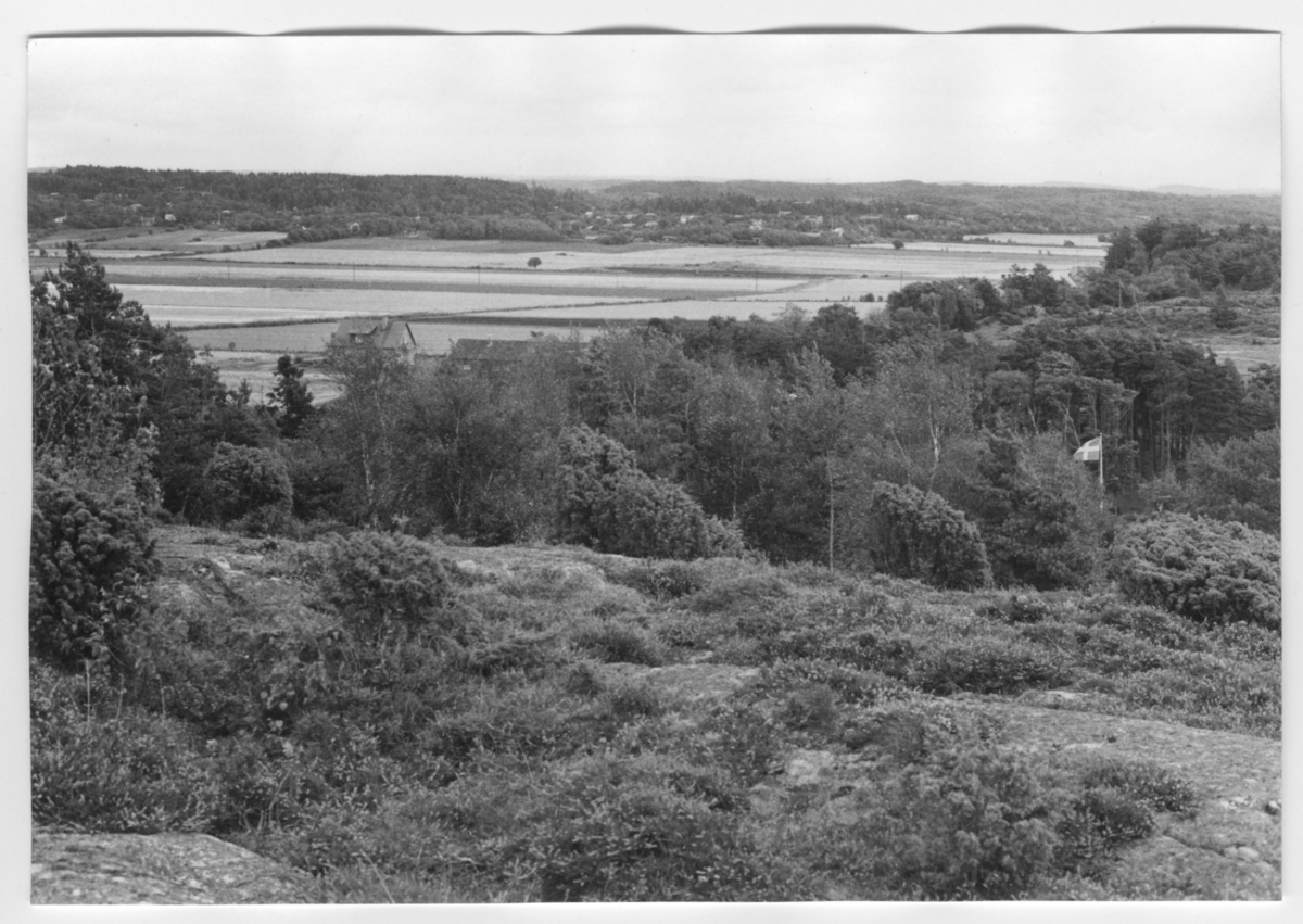 'Bildtext: ''Sedimentyta. Riktning 92.'' I förgrunden berghäll med enbuskar och ljungvegetation. Vy ut över öppna fält, åkrar, gård, hus. Flaggstång. :: :: Ingår i serie med fotonr. 6970:1-1125, dokumentation av Hisingens naturgeografi, visande landskapsformerna i stora drag och gjord inför exploateringen av området. Platserna för fotograferingen finns utsatta på karta i skala 1:4000 som finns på Göteborgs Naturhistoriska musem. Fotoriktningen mättes med kompass i gammalgrader.'