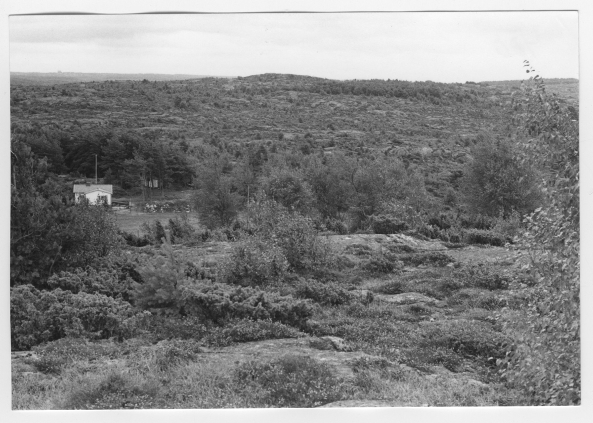 'Bildtext: ''Hällandskap. Riktning 164.'' Vy över berghäll med enbuskar, tall och björk. På avstånd hus, stuga med flaggstång. :: :: Ingår i serie med fotonr. 6970:1-1125, dokumentation av Hisingens naturgeografi, visande landskapsformerna i stora drag och gjord inför exploateringen av området. Platserna för fotograferingen finns utsatta på karta i skala 1:4000 som finns på Göteborgs Naturhistoriska musem. Fotoriktningen mättes med kompass i gammalgrader.'