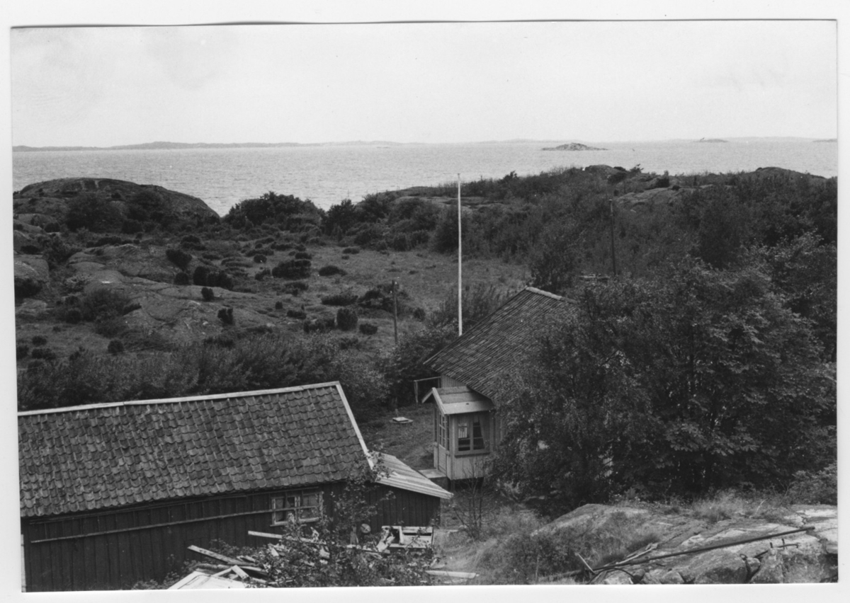 'Bildtext: ''Strandäng. Riktning 254.'' :: Vy med stuga, småhus i förgrunden. Öppen gräsyta, strandängen med enbuskar på avstånd och berghällar, vy ut mot havet med skär, öar. :: :: Ingår i serie med fotonr. 6970:1-1125, dokumentation av Hisingens naturgeografi, visande landskapsformerna i stora drag och gjord inför exploateringen av området. Platserna för fotograferingen finns utsatta på karta i skala 1:4000 som finns på Göteborgs Naturhistoriska musem. Fotoriktningen mättes med kompass i gammalgrader.'