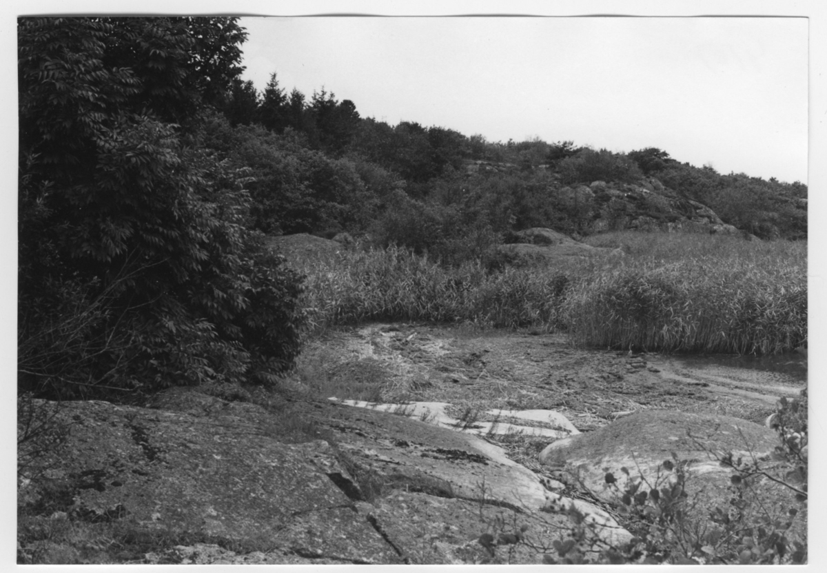 'Bildtext: ''Vassvegetation i strandzon. Riktning 230.'' I förgrunden berghäll ner mot strandkanten med vass. Vy med berghällar med trädvegetation bl.a. gran och lövträd. :: :: Ingår i serie med fotonr. 6970:1-1125, dokumentation av Hisingens naturgeografi, visande landskapsformerna i stora drag och gjord inför exploateringen av området. Platserna för fotograferingen finns utsatta på karta i skala 1:4000 som finns på Göteborgs Naturhistoriska musem. Fotoriktningen mättes med kompass i gammalgrader.'