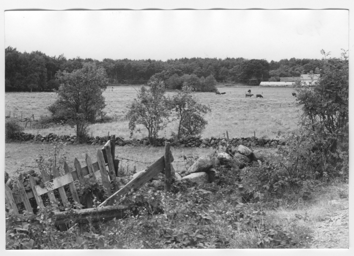 'Bildtext: ''Sedimentdalgång. Riktning 292.'' I förgrunden snår invid staket av taggtråd. Rönnträd invid. Stenmur med enstaka träd. Betande nötboskap och på avstånd gård. Stengärdesgård. :: :: Ingår i serie med fotonr. 6970:1-1125, dokumentation av Hisingens naturgeografi, visande landskapsformerna i stora drag och gjord inför exploateringen av området. Platserna för fotograferingen finns utsatta på karta i skala 1:4000 som finns på Göteborgs Naturhistoriska musem. Fotoriktningen mättes med kompass i gammalgrader.'