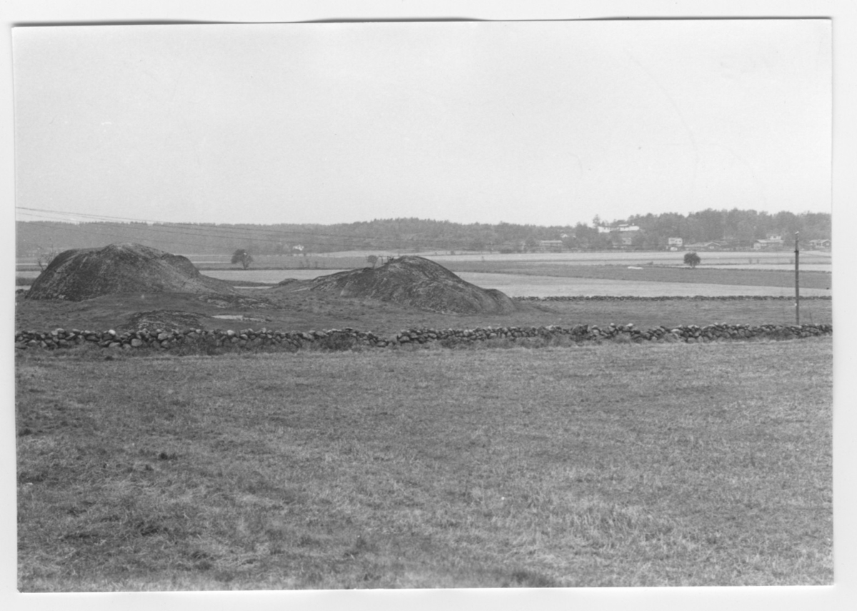 'Bildtext: ''Bergknallar på sedimentytor. Riktning 250.'' I förgrunden öppen gräsmark, vy med stenmur och 2 bergknallar på ev. betesmark. I fonden öppna fält, åkrar och hus. Stengärdesgård. :: :: Ingår i serie med fotonr. 6970:1-1125, dokumentation av Hisingens naturgeografi, visande landskapsformerna i stora drag och gjord inför exploateringen av området. Platserna för fotograferingen finns utsatta på karta i skala 1:4000 som finns på Göteborgs Naturhistoriska musem. Fotoriktningen mättes med kompass i gammalgrader.'