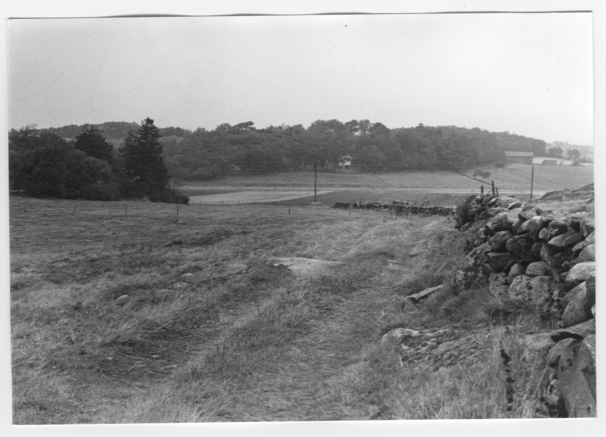 'Bildtext: ''Sedimentdalgång. Riktning 30.'' I förgrunden öppen gräsmark och stenmur. Vy med öppna fält, åkrar, träddungar och hus. I fonden skog. Stengärdesgård. :: :: Ingår i serie med fotonr. 6970:1-1125, dokumentation av Hisingens naturgeografi, visande landskapsformerna i stora drag och gjord inför exploateringen av området. Platserna för fotograferingen finns utsatta på karta i skala 1:4000 som finns på Göteborgs Naturhistoriska musem. Fotoriktningen mättes med kompass i gammalgrader.'
