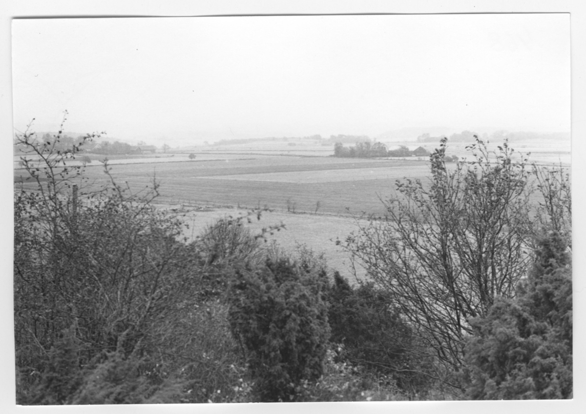 'Bildtext: ''Sedimentyta. Riktning 68.'' I förgrunden enbuskar och lövträd, vy ut över öppna fält, åkrar med träddungar med hus, gårdsbyggnader. :: :: Ingår i serie med fotonr. 6970:1-1125, dokumentation av Hisingens naturgeografi, visande landskapsformerna i stora drag och gjord inför exploateringen av området. Platserna för fotograferingen finns utsatta på karta i skala 1:4000 som finns på Göteborgs Naturhistoriska musem. Fotoriktningen mättes med kompass i gammalgrader.'
