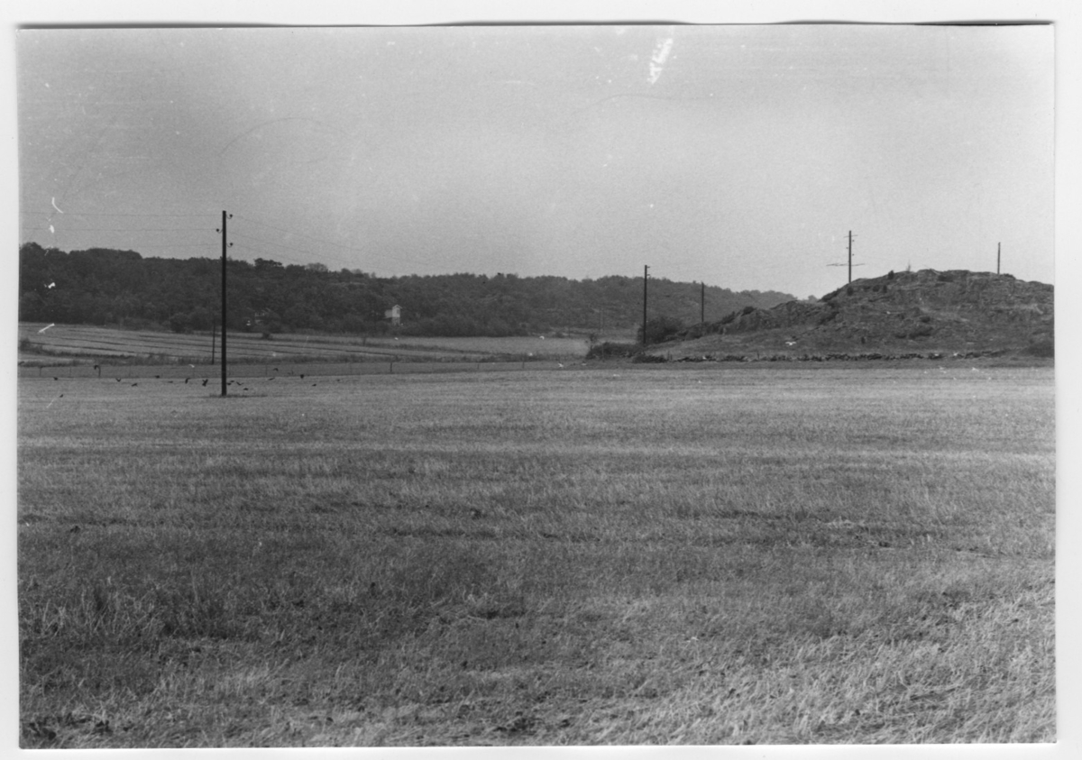 'Bildtext: ''Sedimentdalgång. Rikning 70.'' I förgrunden öppet fält, åker med fåglar som slår sig ner. Vy med elledning och öppna fält, åkrar med ev. stenmurar. Berg med enbuskar. På avstånd hus och skog. Stengärdesgård. :: :: Ingår i serie med fotonr. 6970:1-1125, dokumentation av Hisingens naturgeografi, visande landskapsformerna i stora drag och gjord inför exploateringen av området. Platserna för fotograferingen finns utsatta på karta i skala 1:4000 som finns på Göteborgs Naturhistoriska musem. Fotoriktningen mättes med kompass i gammalgrader.'