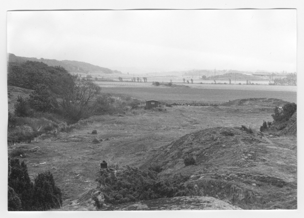 'Bildtext: ''Sedimentdalgång. Riktning 104.'' I förgrunden berghäll med enbuskar, nedanför öppen gräsmark. Vy ut över öppna fält, åkrar med enstaka träd. På avstånd gårdsbyggnader. :: :: Ingår i serie med fotonr. 6970:1-1125, dokumentation av Hisingens naturgeografi, visande landskapsformerna i stora drag och gjord inför exploateringen av området. Platserna för fotograferingen finns utsatta på karta i skala 1:4000 som finns på Göteborgs Naturhistoriska musem. Fotoriktningen mättes med kompass i gammalgrader.'