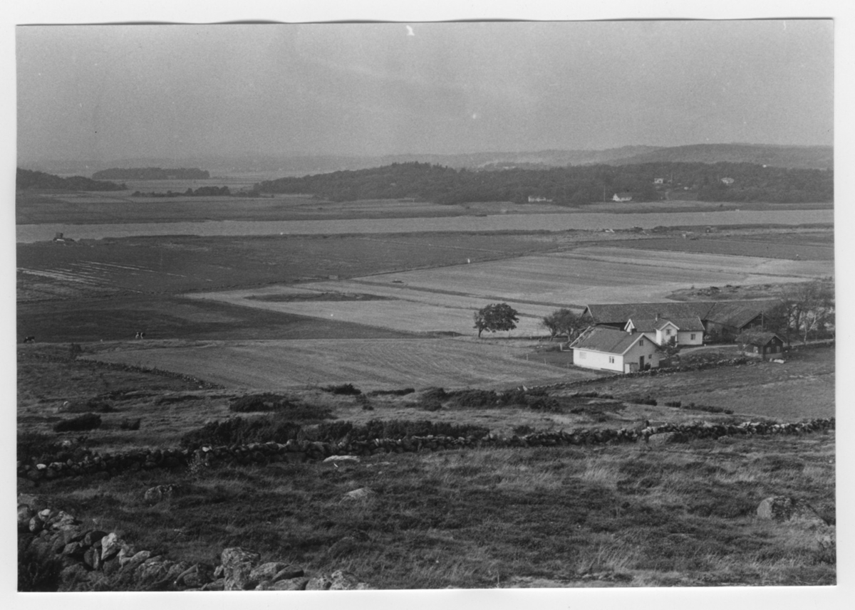 'Bildtext: ''Sedimentdalgång. Riktning 326.'' I förgrunden öppen gräsbevuxen mark med ljung och lösa stenblock. Omgärdad av stenmur. Betande nötboskap. Nedanför liggande gård. Vy ut över öppna fält, åkrar och på avstånd hus. Stengärdesgård. :: :: Ingår i serie med fotonr. 6970:1-1125, dokumentation av Hisingens naturgeografi, visande landskapsformerna i stora drag och gjord inför exploateringen av området. Platserna för fotograferingen finns utsatta på karta i skala 1:4000 som finns på Göteborgs Naturhistoriska musem. Fotoriktningen mättes med kompass i gammalgrader.'