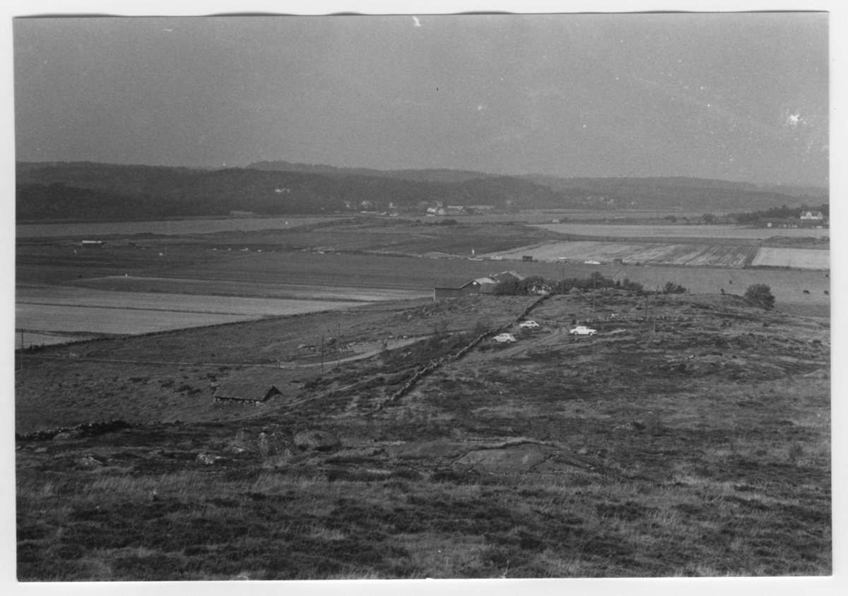 'Bildtext: ''Sedimentdalgång. Riktning 8.'' Vy ut över berghäll med gräs- och ljungvegetation och med stenmurar och parkerade bilar. Vy ut över öppna fält, åkrar och gårsbyggnader, hus. Till vänster lägre byggnad med taket synligt. Grind. Elledning. Stengärdesgård. :: :: Ingår i serie med fotonr. 6970:1-1125, dokumentation av Hisingens naturgeografi, visande landskapsformerna i stora drag och gjord inför exploateringen av området. Platserna för fotograferingen finns utsatta på karta i skala 1:4000 som finns på Göteborgs Naturhistoriska musem. Fotoriktningen mättes med kompass i gammalgrader.'