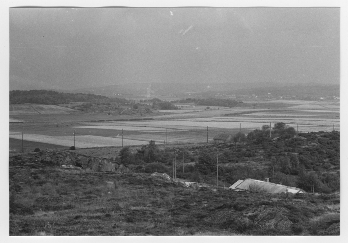 'Bildtext: ''Sedimentdalgång. Riktning 70.'' Vy tagen uppifrån berghäll med hus och ner över öppna fält, åkrar. Elledning. :: :: Ingår i serie med fotonr. 6970:1-1125, dokumentation av Hisingens naturgeografi, visande landskapsformerna i stora drag och gjord inför exploateringen av området. Platserna för fotograferingen finns utsatta på karta i skala 1:4000 som finns på Göteborgs Naturhistoriska musem. Fotoriktningen mättes med kompass i gammalgrader.'