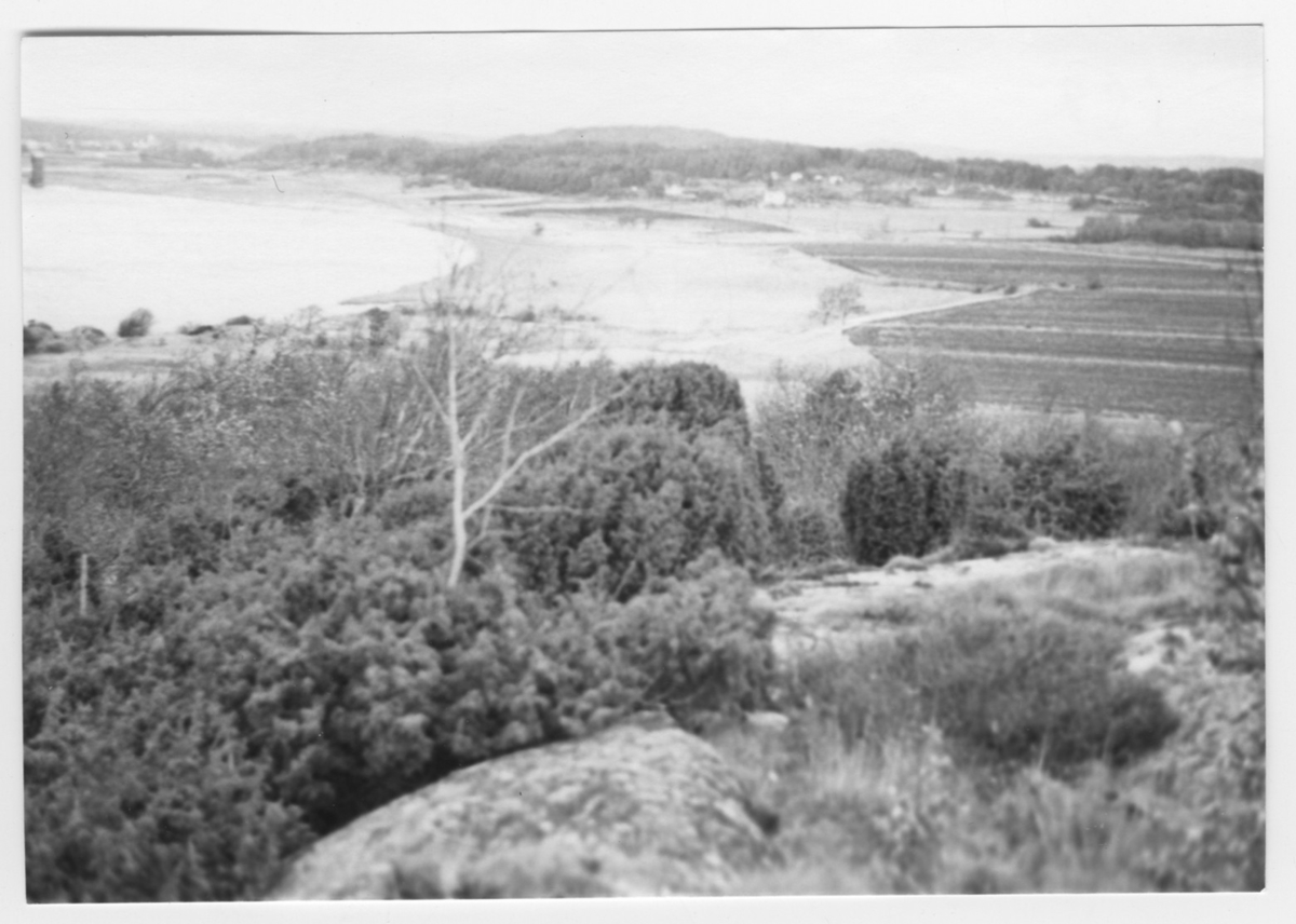 'Bildtext: ''Nordre älv med strandsediment. Riktning 28.'' I förgrunden berghäll med enbuskar. Vy ner över öppna fält och Nordre älvs vatten. :: :: Ingår i serie med fotonr. 6970:1-1125, dokumentation av Hisingens naturgeografi, visande landskapsformerna i stora drag och gjord inför exploateringen av området. Platserna för fotograferingen finns utsatta på karta i skala 1:4000 som finns på Göteborgs Naturhistoriska musem. Fotoriktningen mättes med kompass i gammalgrader.'