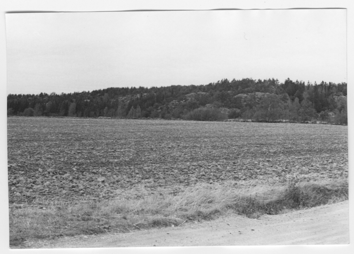 'Bildtext: ''Sedimentyta. Riktning 0 grader.'' Vy över öppet fält, åker intill väg. På avstånd delvis trädbevuxet berg. :: :: Ingår i serie med fotonr. 6970:1-1125, dokumentation av Hisingens naturgeografi, visande landskapsformerna i stora drag och gjord inför exploateringen av området. Platserna för fotograferingen finns utsatta på karta i skala 1:4000 som finns på Göteborgs Naturhistoriska musem. Fotoriktningen mättes med kompass i gammalgrader.'