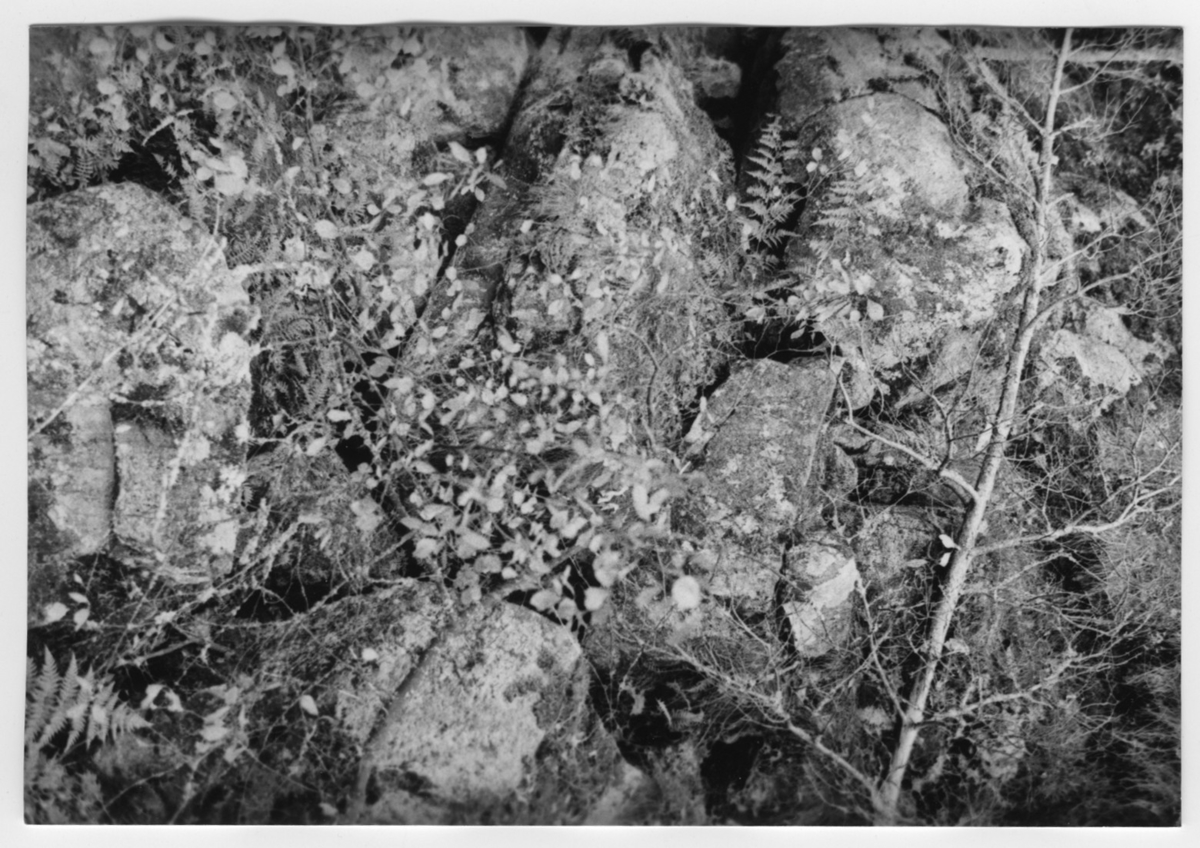 'Bildtext: ''Rasmaterial i spricka. Riktning 140.'' :: :: Ingår i serie med fotonr. 6970:1-1125, dokumentation av Hisingens naturgeografi, visande landskapsformerna i stora drag och gjord inför exploateringen av området. Platserna för fotograferingen finns utsatta på karta i skala 1:4000 som finns på Göteborgs Naturhistoriska musem. Fotoriktningen mättes med kompass i gammalgrader.'