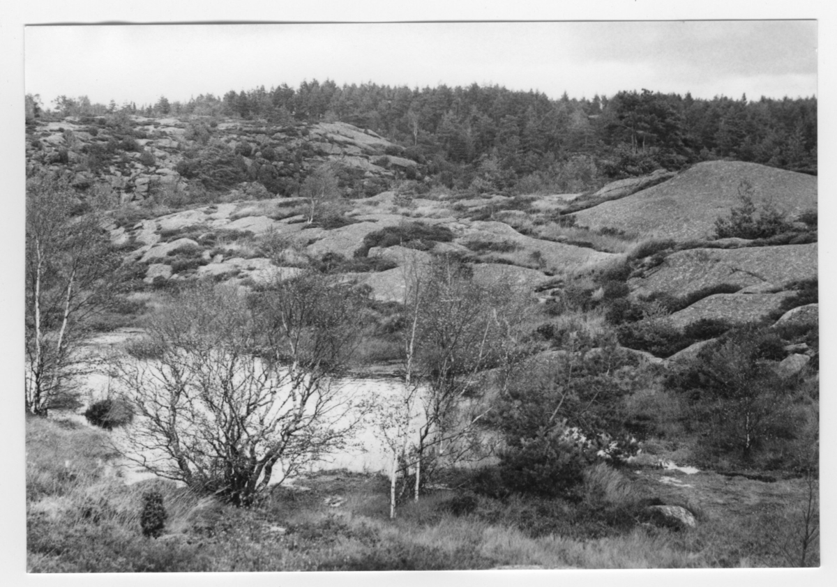 'Bildtext: ''Hällandskap. Riktning 44.'' :: :: Ingår i serie med fotonr. 6970:1-1125, dokumentation av Hisingens naturgeografi, visande landskapsformerna i stora drag och gjord inför exploateringen av området. Platserna för fotograferingen finns utsatta på karta i skala 1:4000 som finns på Göteborgs Naturhistoriska musem. Fotoriktningen mättes med kompass i gammalgrader.'