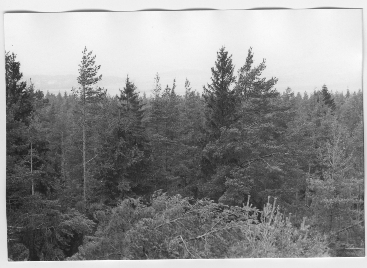 'Bildtext: ''Skogsområde. Riktning 336.'' :: :: Ingår i serie med fotonr. 6970:1-1125, dokumentation av Hisingens naturgeografi, visande landskapsformerna i stora drag och gjord inför exploateringen av området. Platserna för fotograferingen finns utsatta på karta i skala 1:4000 som finns på Göteborgs Naturhistoriska musem. Fotoriktningen mättes med kompass i gammalgrader.'