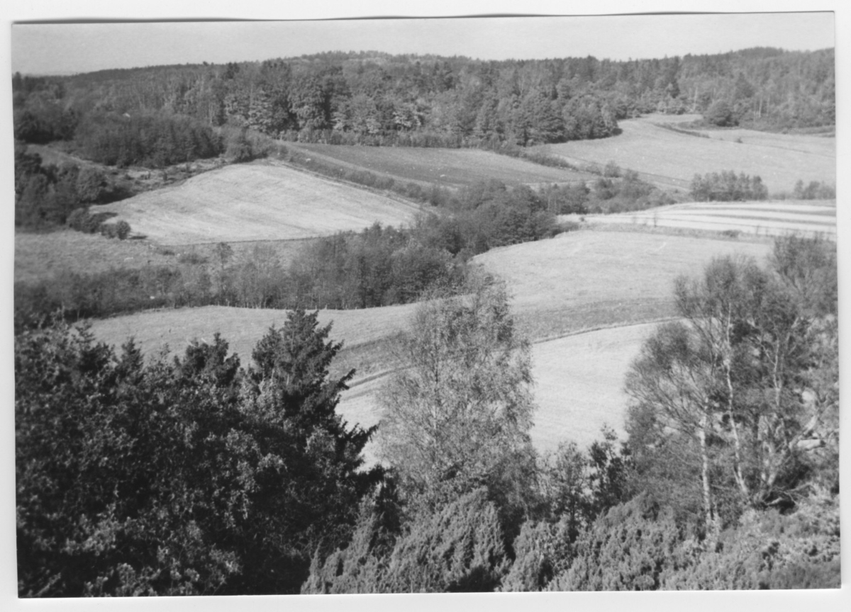 'Bildtext: ''Meandrande bäck i dalgång. Riktning 320.'' Vy ner över dalgången med åkermark och det slingrande vattendraget med trädridåer längs sidorna. :: :: Ingår i serie med fotonr. 6970:1-1125, dokumentation av Hisingens naturgeografi, visande landskapsformerna i stora drag och gjord inför exploateringen av området. Platserna för fotograferingen finns utsatta på karta i skala 1:4000 som finns på Göteborgs Naturhistoriska musem. Fotoriktningen mättes med kompass i gammalgrader.'