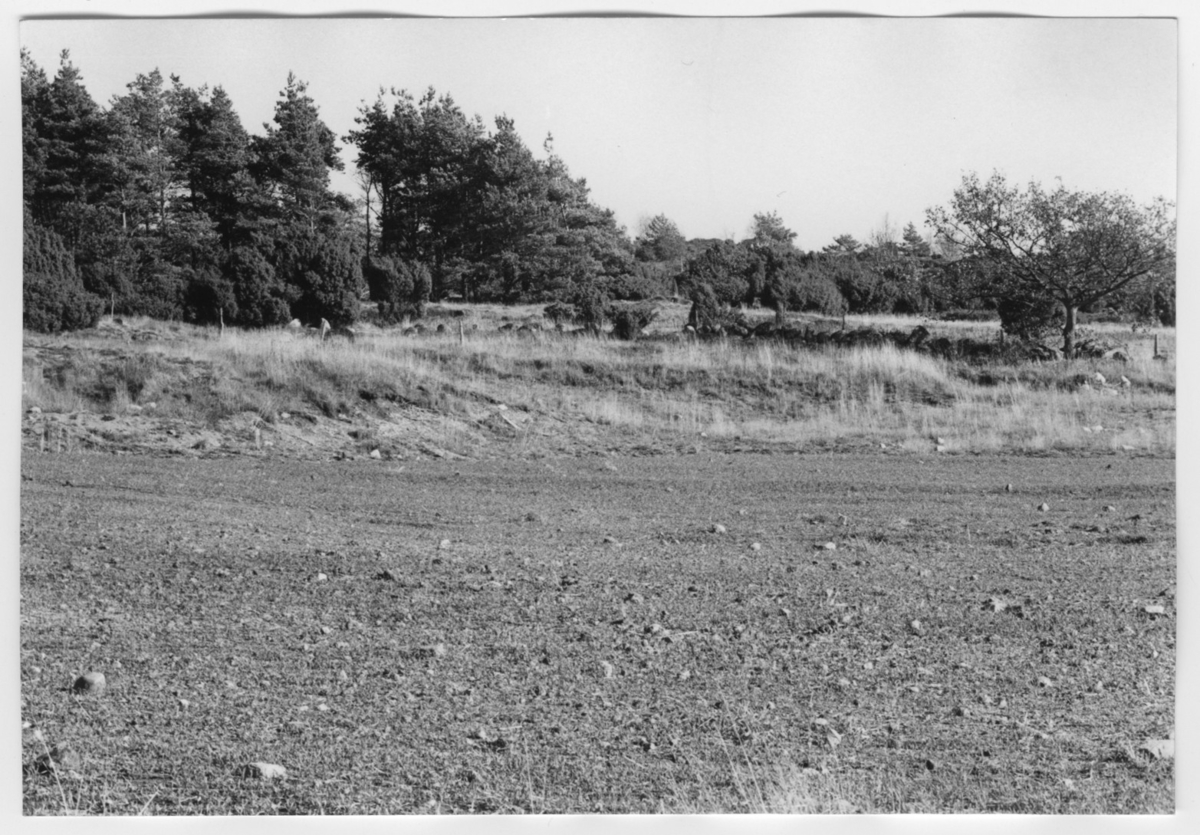 'Bildtext: ''Åker med skalgrus. Riktning 100.'' :: :: Ingår i serie med fotonr. 6970:1-1125, dokumentation av Hisingens naturgeografi, visande landskapsformerna i stora drag och gjord inför exploateringen av området. Platserna för fotograferingen finns utsatta på karta i skala 1:4000 som finns på Göteborgs Naturhistoriska musem. Fotoriktningen mättes med kompass i gammalgrader.'