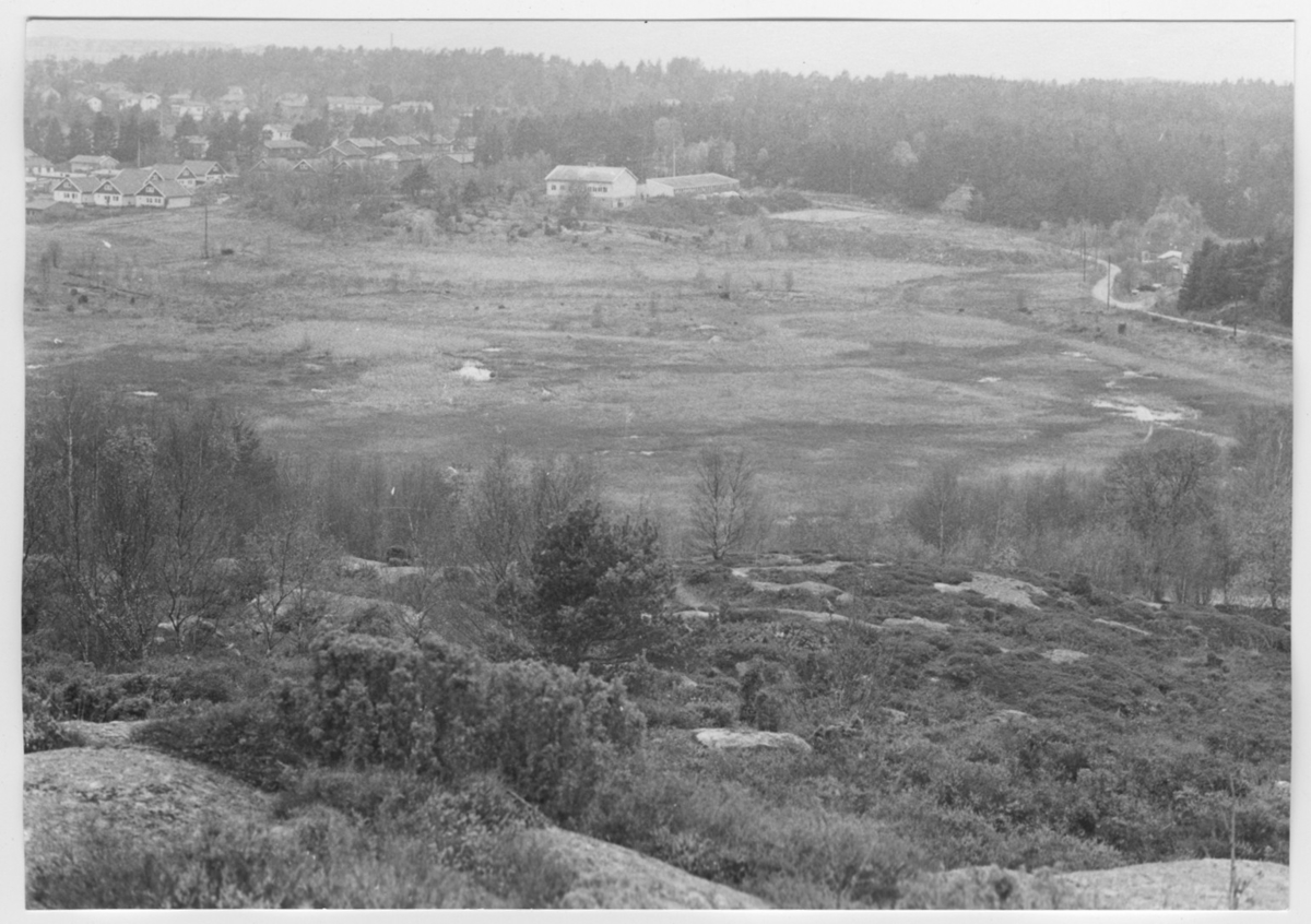 'Bildtext: ''Kärr. Riktning 268.'' :: :: Ingår i serie med fotonr. 6970:1-1125, dokumentation av Hisingens naturgeografi, visande landskapsformerna i stora drag och gjord inför exploateringen av området. Platserna för fotograferingen finns utsatta på karta i skala 1:4000 som finns på Göteborgs Naturhistoriska musem. Fotoriktningen mättes med kompass i gammalgrader. :: :: I bildens mitt syns Kärrdalsskolan. Kedjehusen på vänster sida är bebyggelsen Lilla Myrekärrsvägen 14-18. Vägen som går förbi skolan och vidare på höger sida är Gamla Gunnestorpsvägen. :: Källa: Leevi Babarin'
