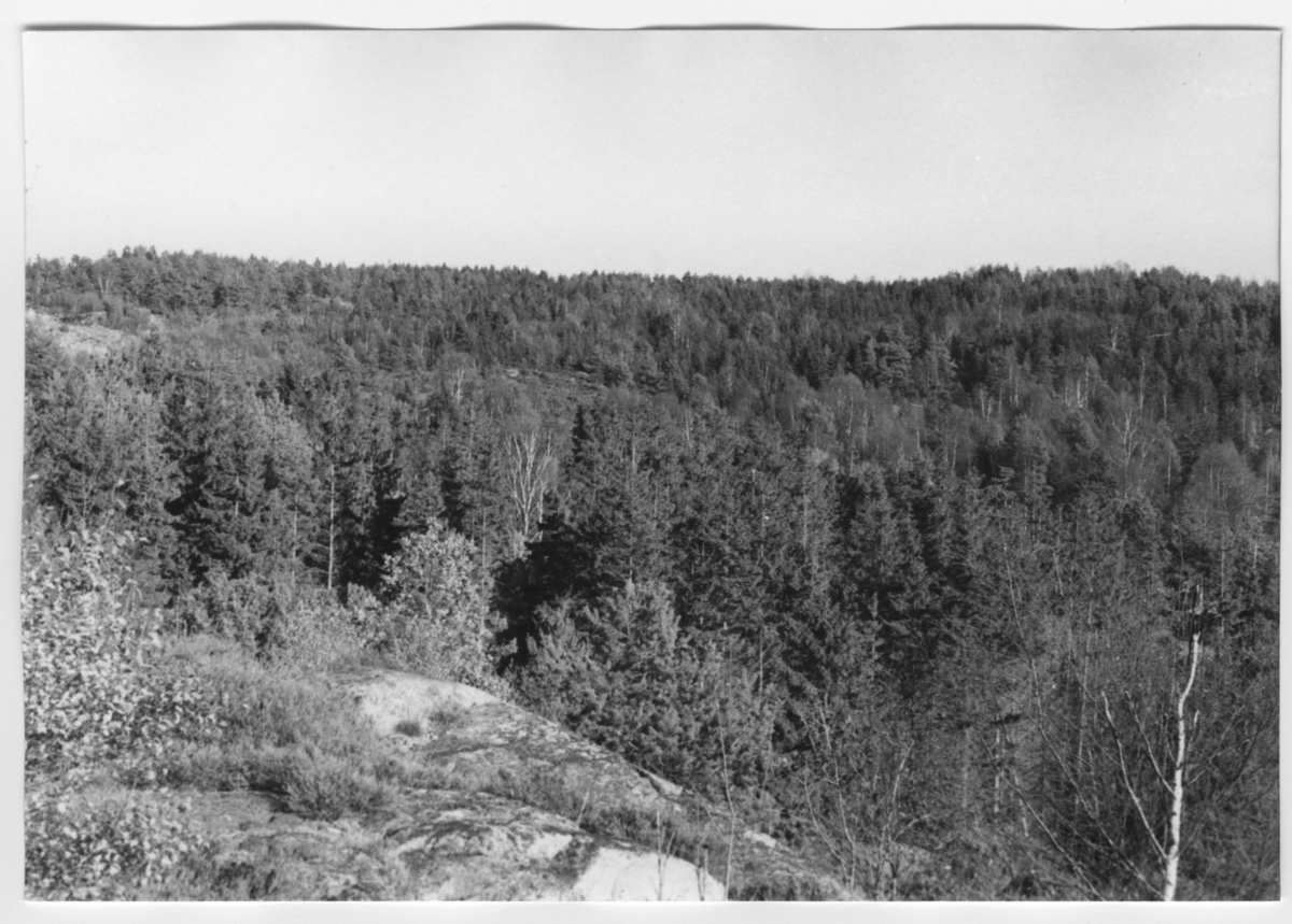'Bildtext: ''Skogsområde. Riktning 21.'' :: :: Ingår i serie med fotonr. 6970:1-1125, dokumentation av Hisingens naturgeografi, visande landskapsformerna i stora drag och gjord inför exploateringen av området. Platserna för fotograferingen finns utsatta på karta i skala 1:4000 som finns på Göteborgs Naturhistoriska musem. Fotoriktningen mättes med kompass i gammalgrader.'
