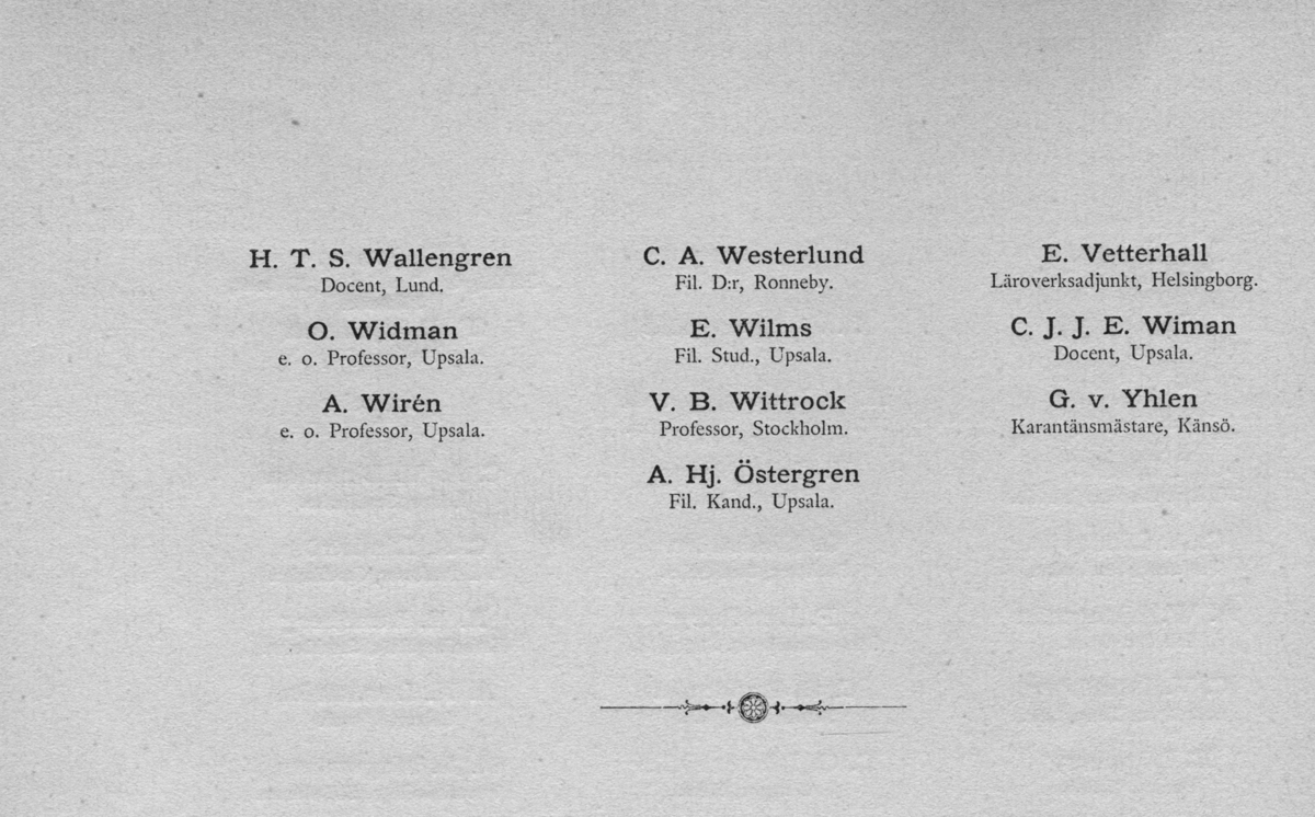 'Namnlista på de som gratulerat professor Wilhelm Lilljeborgs med porträtt på hans 80-årsdag. Porträttet se fotonr. 6974:1-2. Namnlista se fotonr. 6974:3-5 s.1-3. :: :: Ingår i serie med fotonr. 6974:1-5.'