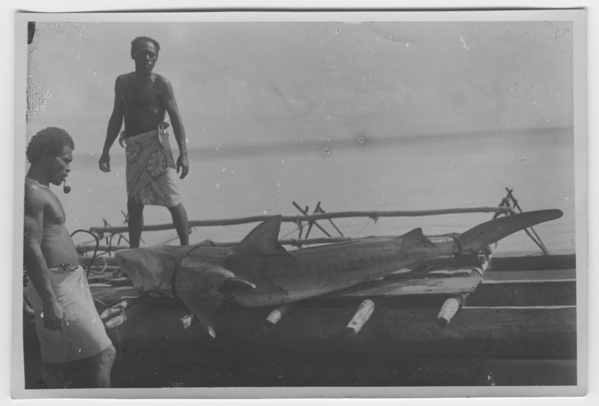 'Bock och Hessle: Gilbertöarnaexpeditionen: :: :: 2 män med höftbeklädnader invid 1 haj. Text på baksidan: ''Nyspjutad haj (Carcharias). Vy med hav. :: :: Ingår i serie med fotonr. 6977:1-15.'