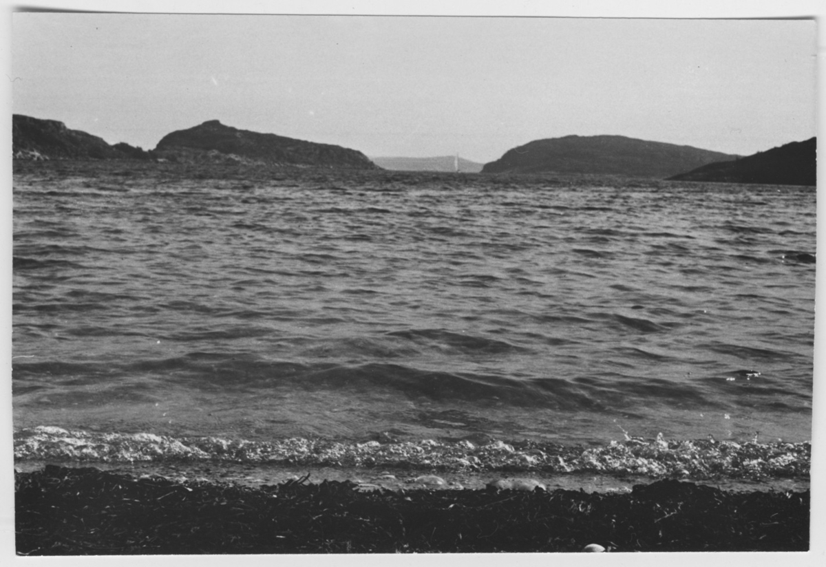 'Fotounderlag för stranddiorama, enligt kuvert. Vy med strandkant med tång och berg längre ut. :: :: Ingår i serie med fotonr. 6979:1-5.'