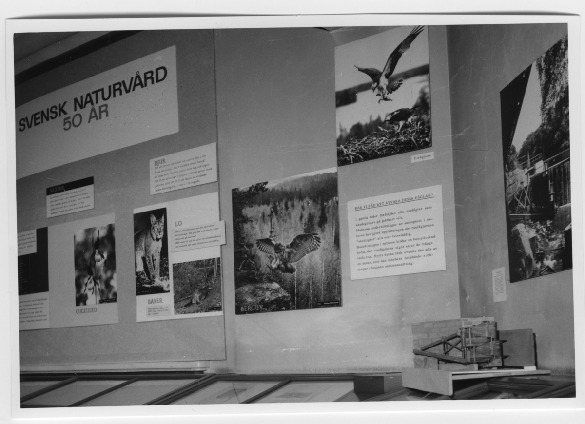 'Utställningsskärm med titel ''Svensk Naturvård 50 år'', text och bilder med bl.a. lodjur, guckosko, berguv, bäver och fiskgjuse. :: Ingår i serie med fotonr. 6983:1-22.'