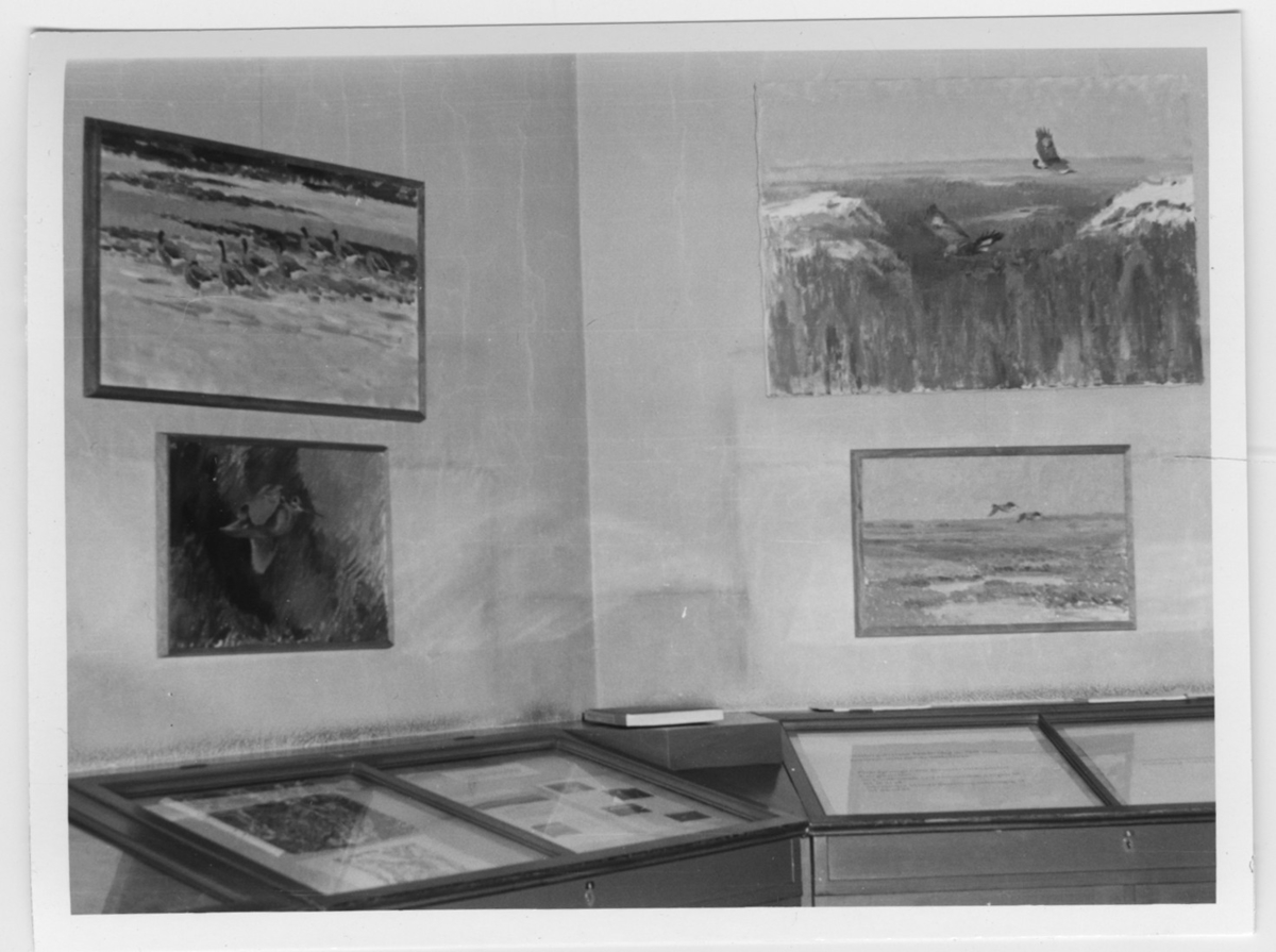 '4 st tavlor med fågelmotiv ovanför trämontrar med glaslock. :: :: Ingår i serie med fotonr. 6983:1-22.'