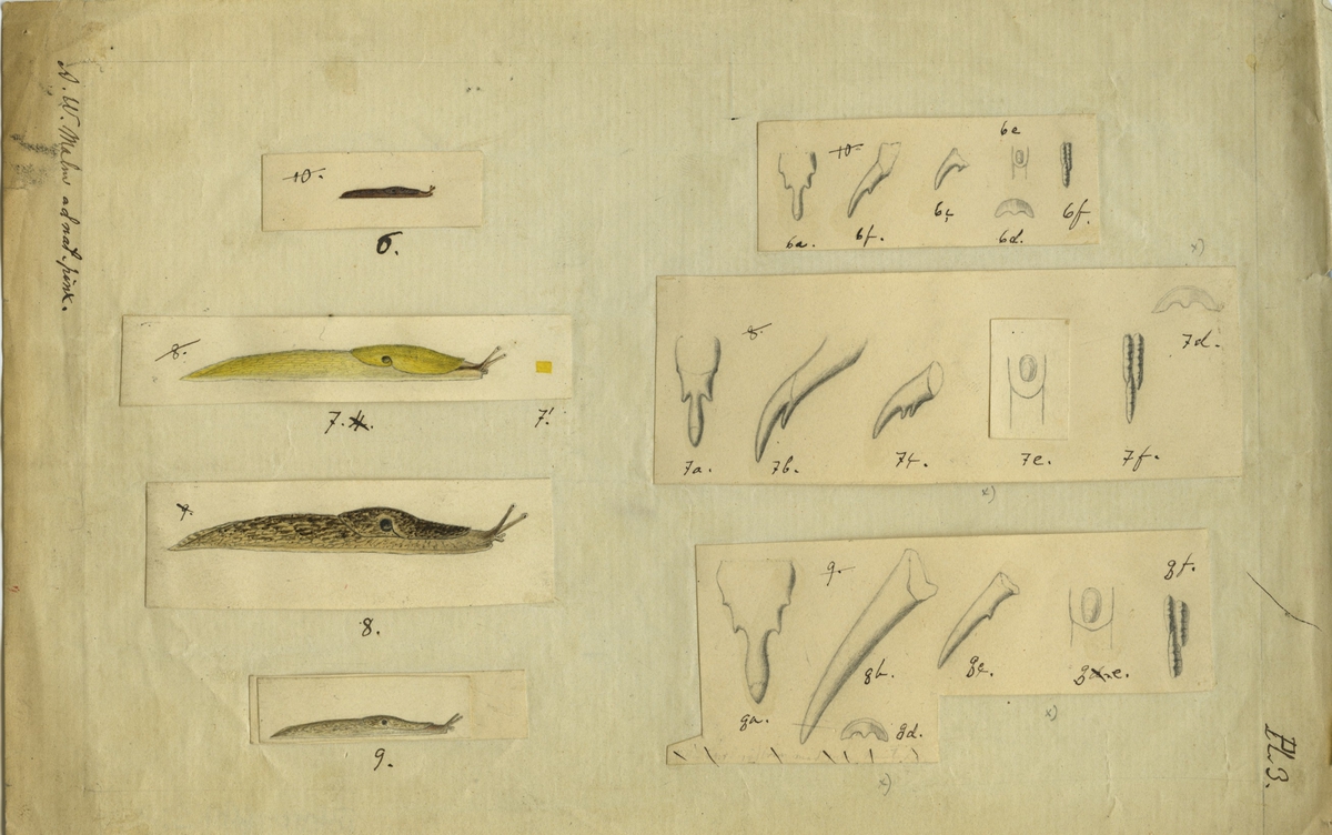 'Ark med diverse skisser, foton? och teckningar av sniglar. :: Ingår i serie med fotonr. 6993:1-5 med originalteckningar och foton på sniglar av August Wilhelm Malm.'
