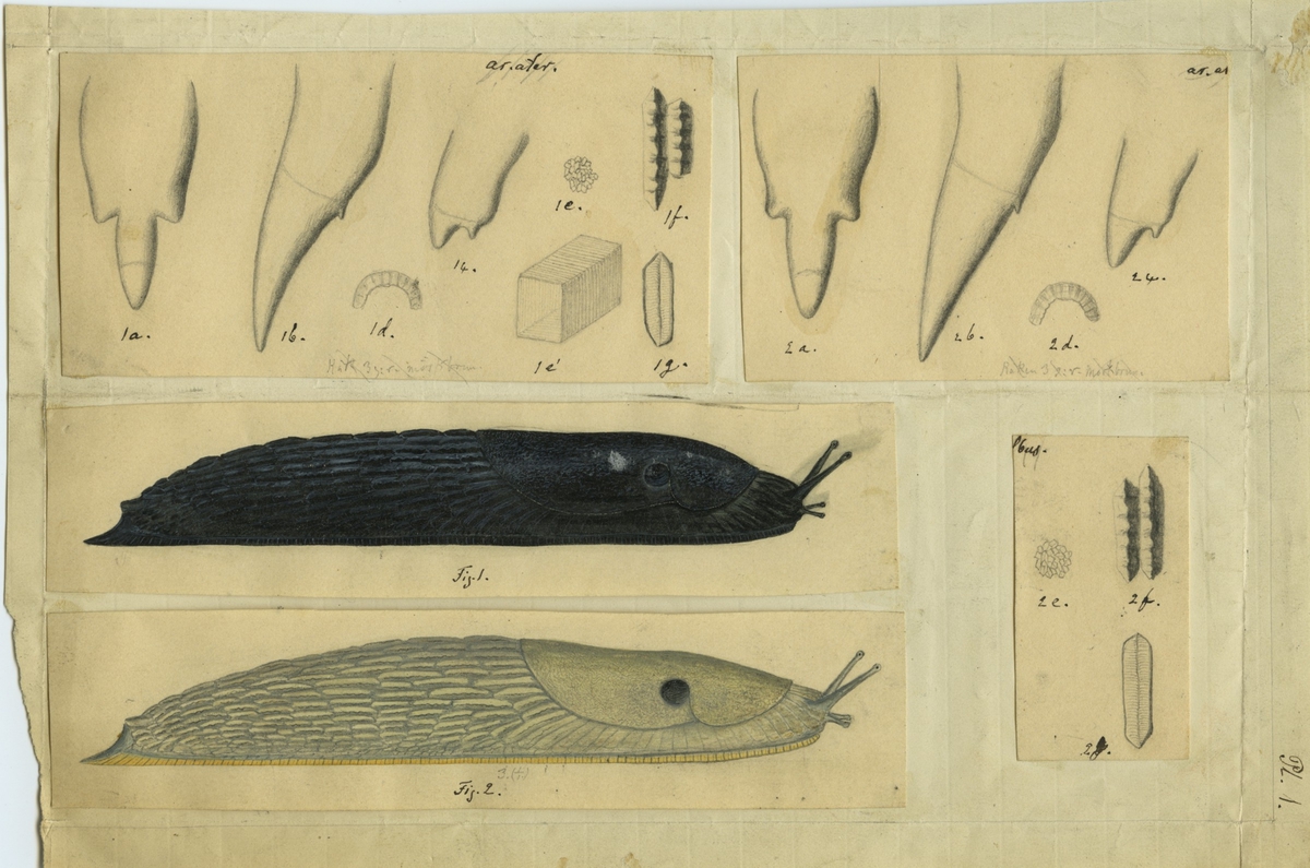 'Ark med diverse skisser, foton? och teckningar av sniglar. :: :: Ingår i serie med fotonr. 6993:1-5 med originalteckningar och foton på sniglar av August Wilhelm Malm.'
