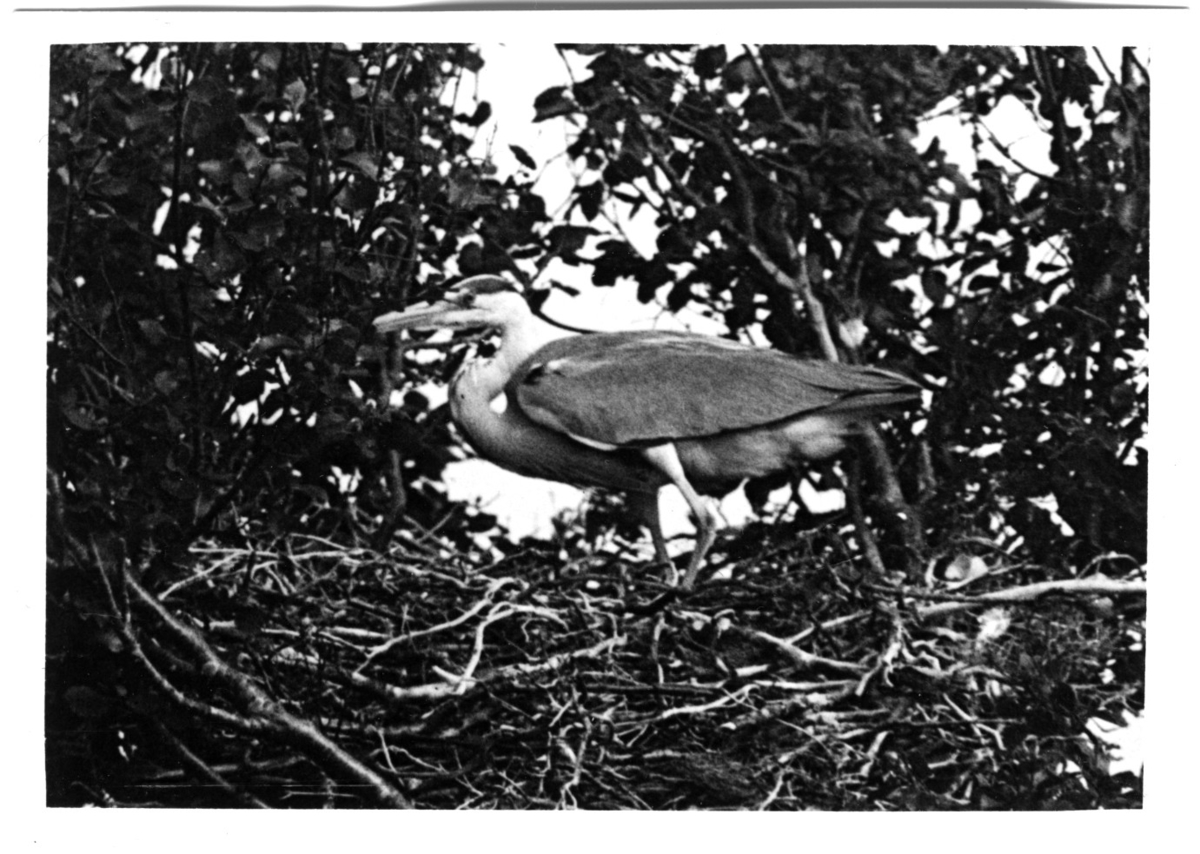 'Häger stående på boet. :: Text till fotot: ''Hägern är en skygg fågel som inte är så lätt att få in i kameran.'' :: :: Ingår i fotonr. 6995:1-51, dessa sitter i ett fotoalbum med tillhörande beskrivningar på norska.'