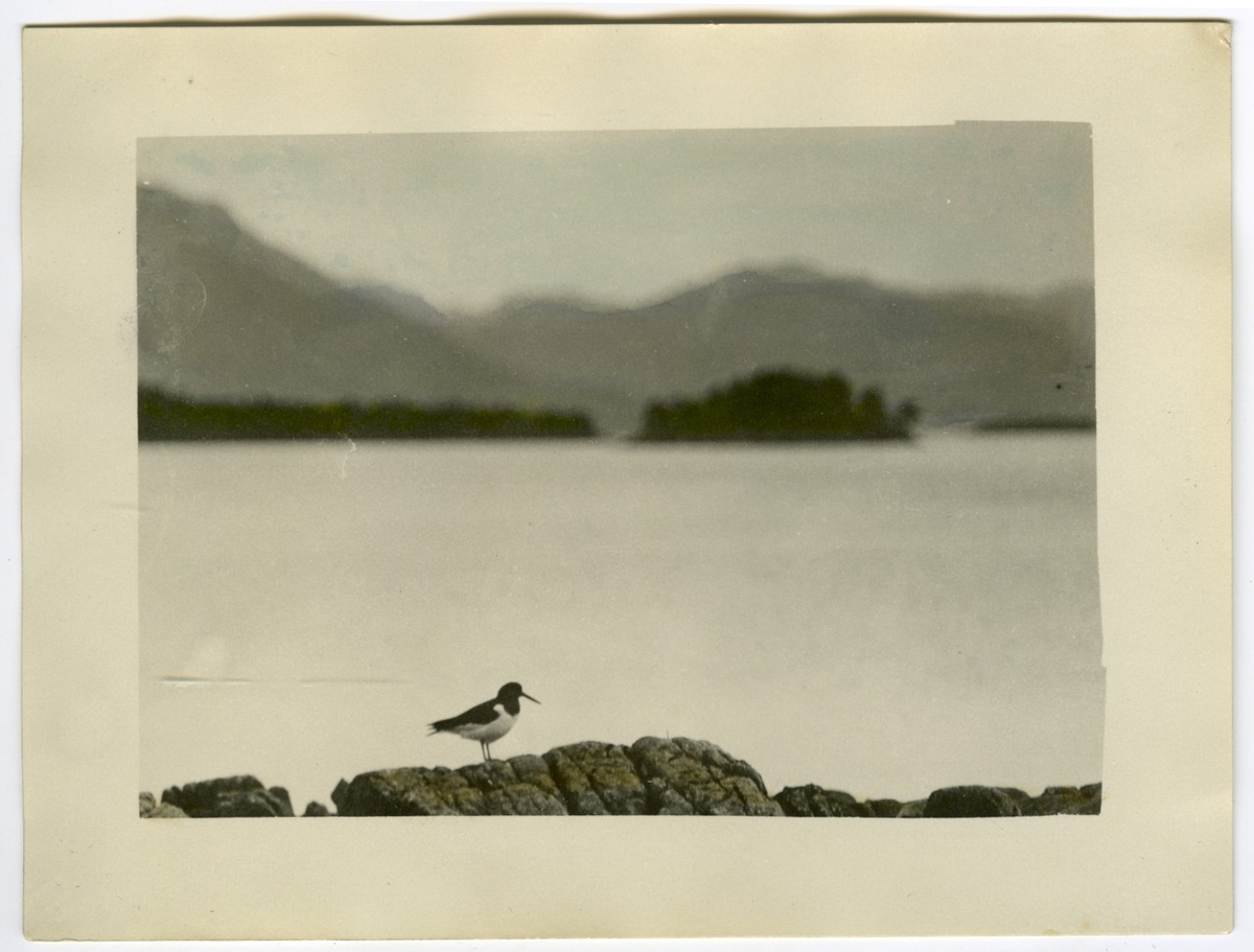 'Vy med 1 st strandskata sitter på berghäll. Vy med hav i bakgrunden. :: Text till fotot: ''Strandskata vid stranden.'' :: :: Ingår i fotonr. 6995:1-51, dessa sitter i ett fotoalbum med tillhörande beskrivningar på norska.'