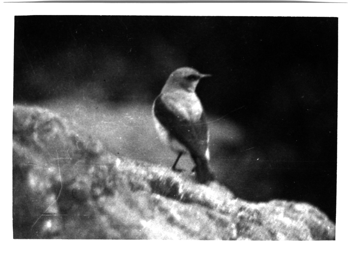 '1 st stenskvätta sedd bakifrån, närbild. :: Text till fotot: ''Denna stenskvätta utgjorde min första fångst som ...jägare.'' :: :: Ingår i fotonr. 6995:1-51, dessa sitter i ett fotoalbum med tillhörande beskrivningar på norska.'