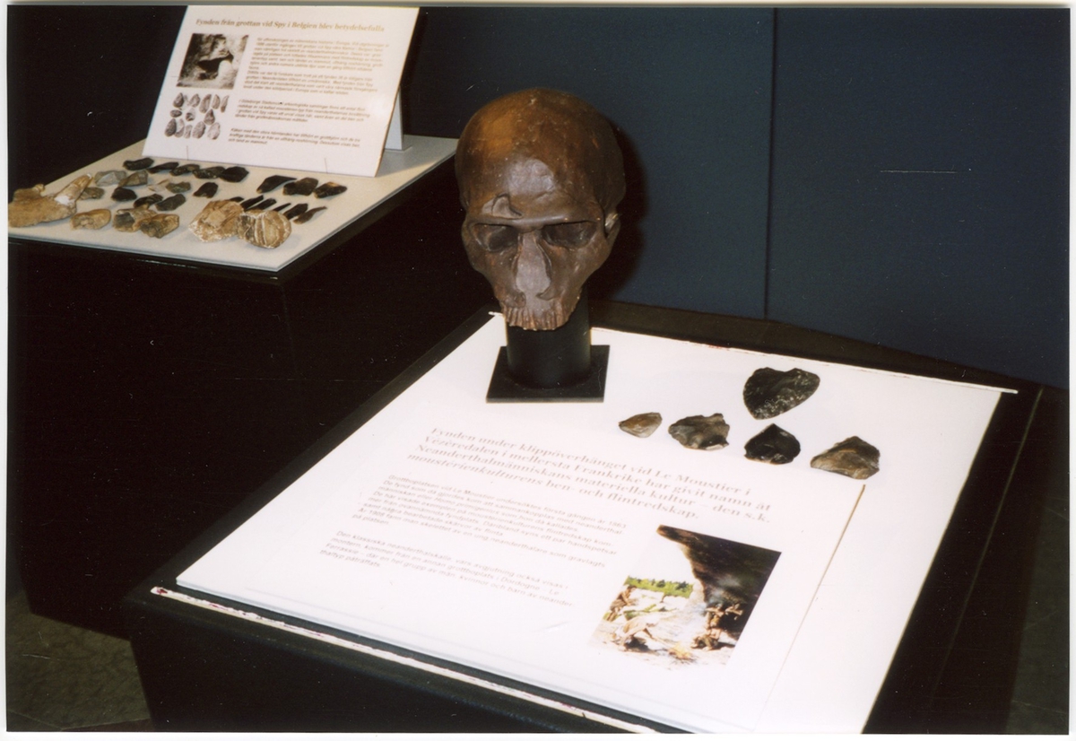 'Närbild på monter med text ''Fynden vid klippöverhänget vid Le Moustier i mellersta Frankrike...'' neanderthalmänniskokranium, flintredskap och bild med text. :: :: Ingår i serie med fotonr. 7000:1-7 med foton tagna på utställningen ''Neanderthal-människan 150 år'' som stod på Göteborgs Naturhistoriska museum 15 november 2006 till 15 mars 2007.'