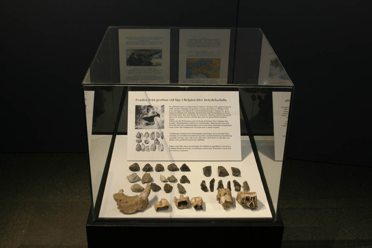 'Glasmonter med rubrik ''Fynden vid från grottan vid Spy i Belgien blev betydelsefulla''. I montern ligger diverse flintredskap av typen moustérien, käke från grottbjörn samt 3 tänder från ullhårig noshörning. :: :: Ingår i serie med fotonr. 7000:1-7 med foton tagna på utställningen ''Neanderthal-människan 150 år'' som stod på Göteborgs Naturhistoriska museum 15 november 2006 till 15 mars 2007.'