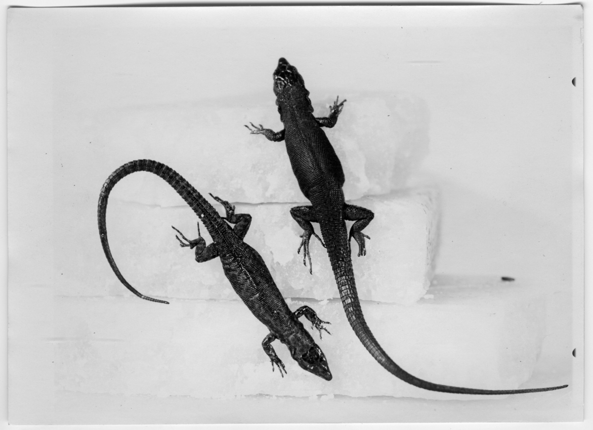 '2 ödlor, hona och hane. :: :: Ingår i serie med fotonr. 7015:1-91 med bilder av reptiler från Otto Cyréns samling.'