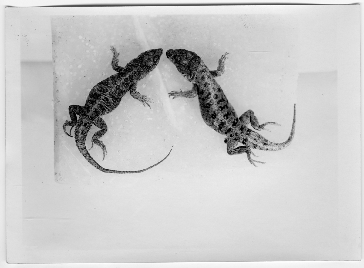 '2 ödlor, hona och hane. :: :: Ingår i serie med fotonr. 7015:1-91 med bilder av reptiler från Otto Cyréns samling.'