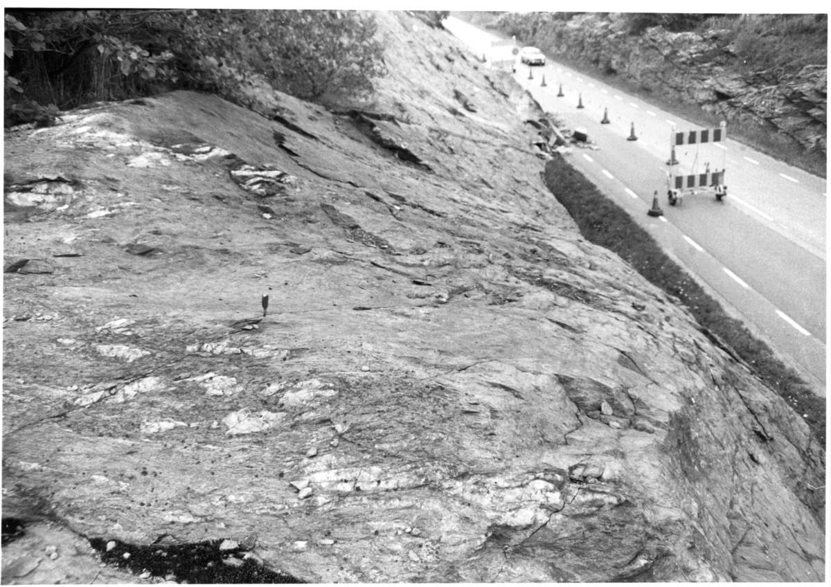 'Fagerfjäll, bergras: :: Vy uppifrån bergväggen ner mot vägen med avspärrning. :: :: Ingår i serie med fotonr. 7019:1-12 med bilder från bergras i Fagerfjäll.'