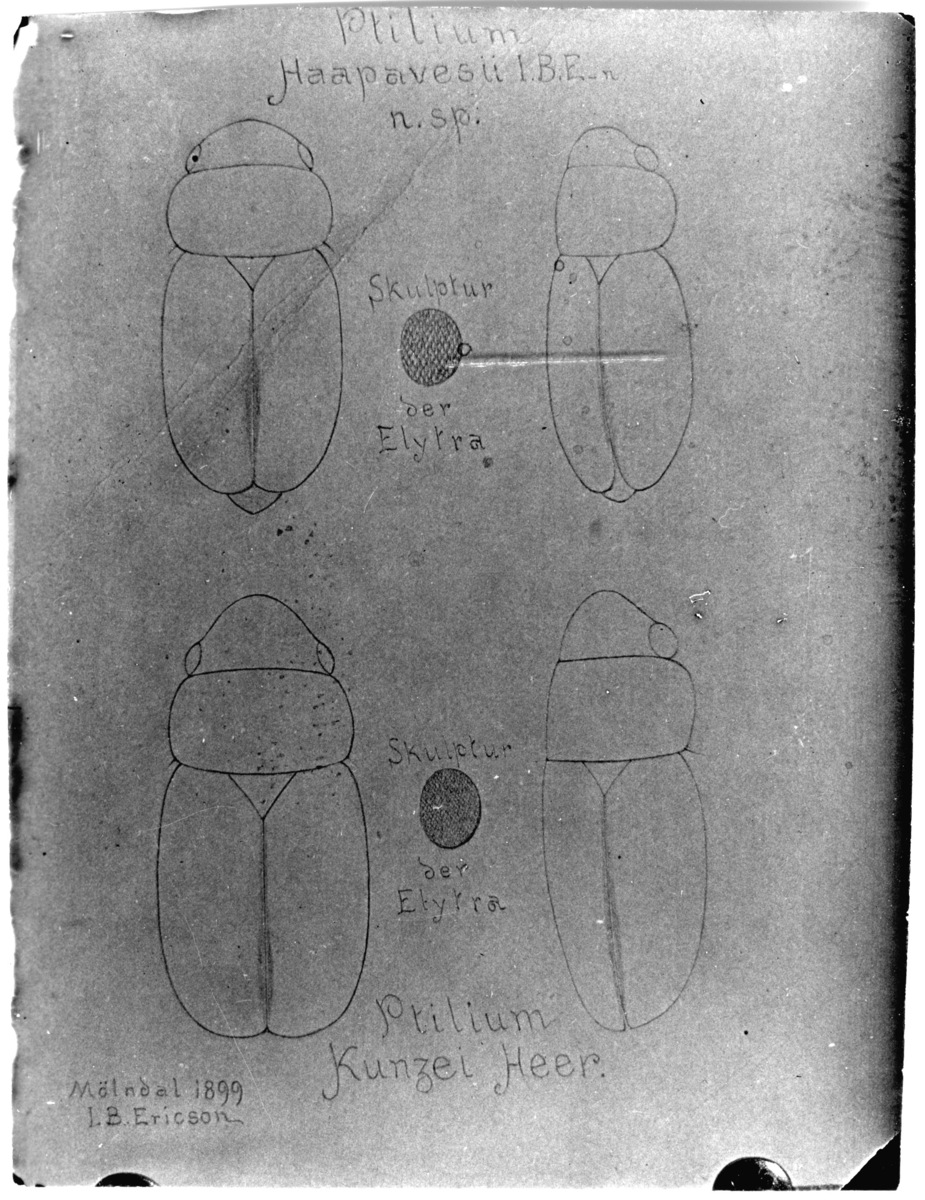 'På bilden står: ''Skulptur der Elytra av Plilium Haapaveslii I.B.E. n. sp (övre teckningen) och Plilium kunzei Heer (undre teckningen), Mölndal 1899, I.B. Ericson.'