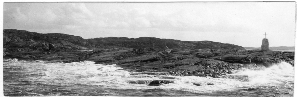 'Bildtext: ''Smygholmen, söder om Marstrand, Lycke socken.'' Vy med vågor som slår mot kala berghällar. Uppbyggt båk, sjömärke i sten med kors på toppen. :: :: Fotonr. 7046:1-84 indelade som ''Landskapsbilder från Göteborgs- och Bohus län.'' Ingår i serie med fotonr. 7046:1-383, 7047:1-33 och 7048:1-67 med bilder från Länsjägmästare John Lindners bildarkiv.'