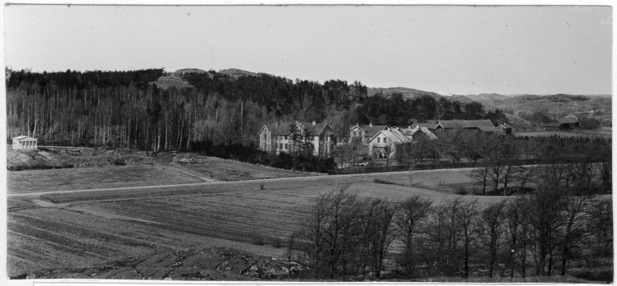 'Bildtext: ''Kulturskog vid Billströmska folkhögskolan.'' Vy med åkermark i förgrunden och hus samlade i klunga. Lövskog och barrskog upp mot berg. :: :: Fotonr. 7046:1-84 indelade som ''Landskapsbilder från Göteborgs- och Bohus län.'' Ingår i serie med fotonr. 7046:1-383, 7047:1-33 och 7048:1-67 med bilder från Länsjägmästare John Lindners bildarkiv.'