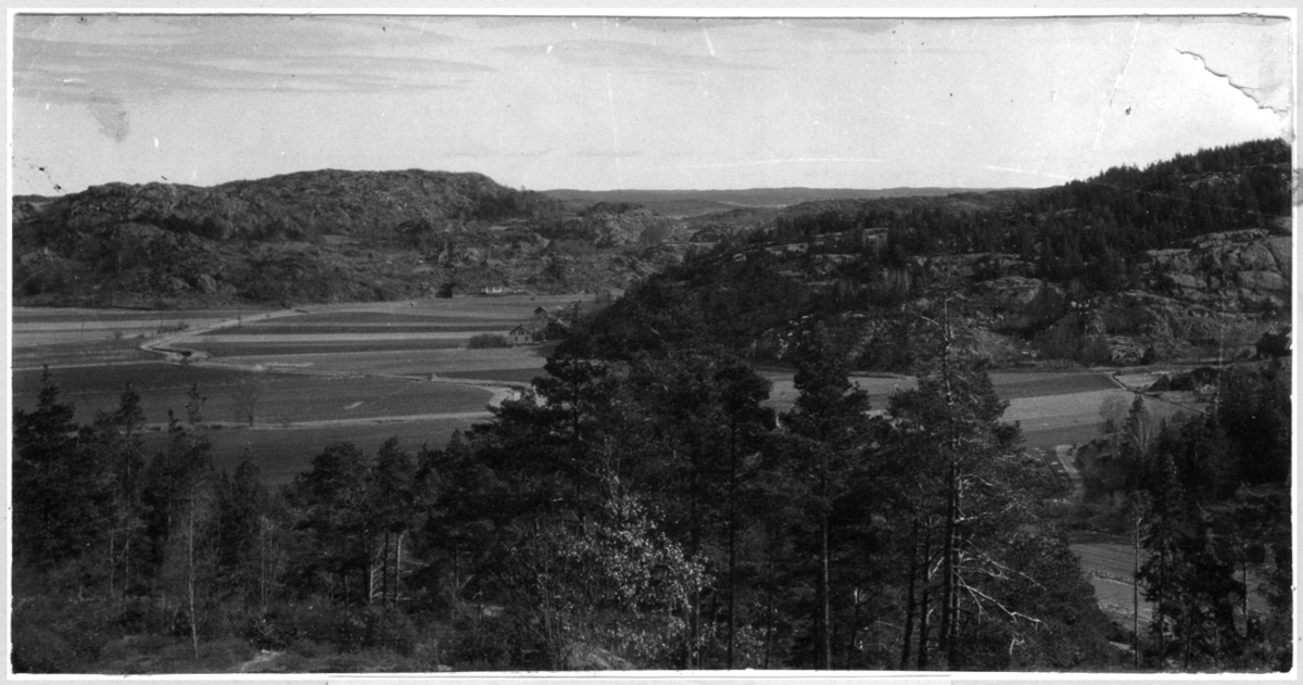 'Bildtext: ''Naturskog.'' Vy med tallskog med öppen åkermark och berg i fonden. Väg och hus. :: :: Fotonr. 7046:1-84 indelade som ''Landskapsbilder från Göteborgs- och Bohus län.'' Ingår i serie med fotonr. 7046:1-383, 7047:1-33 och 7048:1-67 med bilder från Länsjägmästare John Lindners bildarkiv.'
