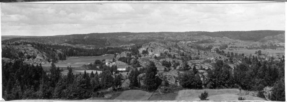 'Bildtext: ''Utsikt från Esperöd söder om Uddevalla mot Herrestadsfjället.'' Vy med delvid trädbevuxna berghällar och spridda hus. :: :: Fotonr. 7046:1-84 indelade som ''Landskapsbilder från Göteborgs- och Bohus län.'' Ingår i serie med fotonr. 7046:1-383, 7047:1-33 och 7048:1-67 med bilder från Länsjägmästare John Lindners bildarkiv.'