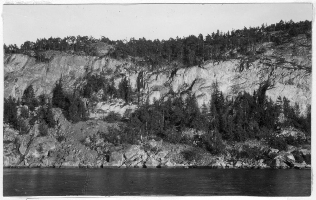 'Bildtext: ''Sydöstra sidan av Saltkällefjorden.'' Vy med delvis trädbevuxen bergvägg, granar. :: :: Fotonr. 7046:1-84 indelade som ''Landskapsbilder från Göteborgs- och Bohus län.'' Ingår i serie med fotonr. 7046:1-383, 7047:1-33 och 7048:1-67 med bilder från Länsjägmästare John Lindners bildarkiv.'
