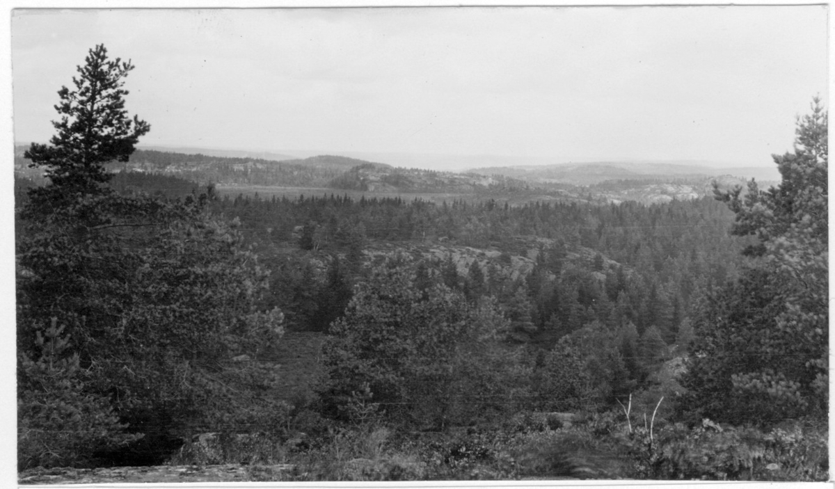 'Bildtext: ''Bild 115. Utsikt från Hästekullen.'' Vy över skog. :: :: Fotonr. 7046:1-84 indelade som ''Landskapsbilder från Göteborgs- och Bohus län.'' Ingår i serie med fotonr. 7046:1-383, 7047:1-33 och 7048:1-67 med bilder från Länsjägmästare John Lindners bildarkiv.'
