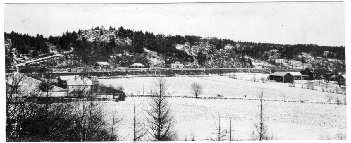 'Bildtext: ''Dingle järnvägsstation.'' Vy över snöklätt landskap med hus och byggnader samt järnvägsspår nedanför delvis trädklätt berg. :: :: Fotonr. 7046:1-84 indelade som ''Landskapsbilder från Göteborgs- och Bohus län.'' Ingår i serie med fotonr. 7046:1-383, 7047:1-33 och 7048:1-67 med bilder från Länsjägmästare John Lindners bildarkiv.'