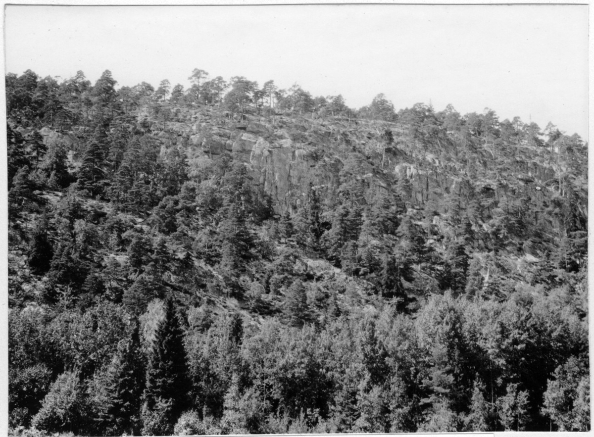 'Bildtext: ''Skogbeväxt berg.'' Vy med granblandskogsbeväxt berg. :: :: Fotonr. 7046:1-84 indelade som ''Landskapsbilder från Göteborgs- och Bohus län.'' Ingår i serie med fotonr. 7046:1-383, 7047:1-33 och 7048:1-67 med bilder från Länsjägmästare John Lindners bildarkiv.'