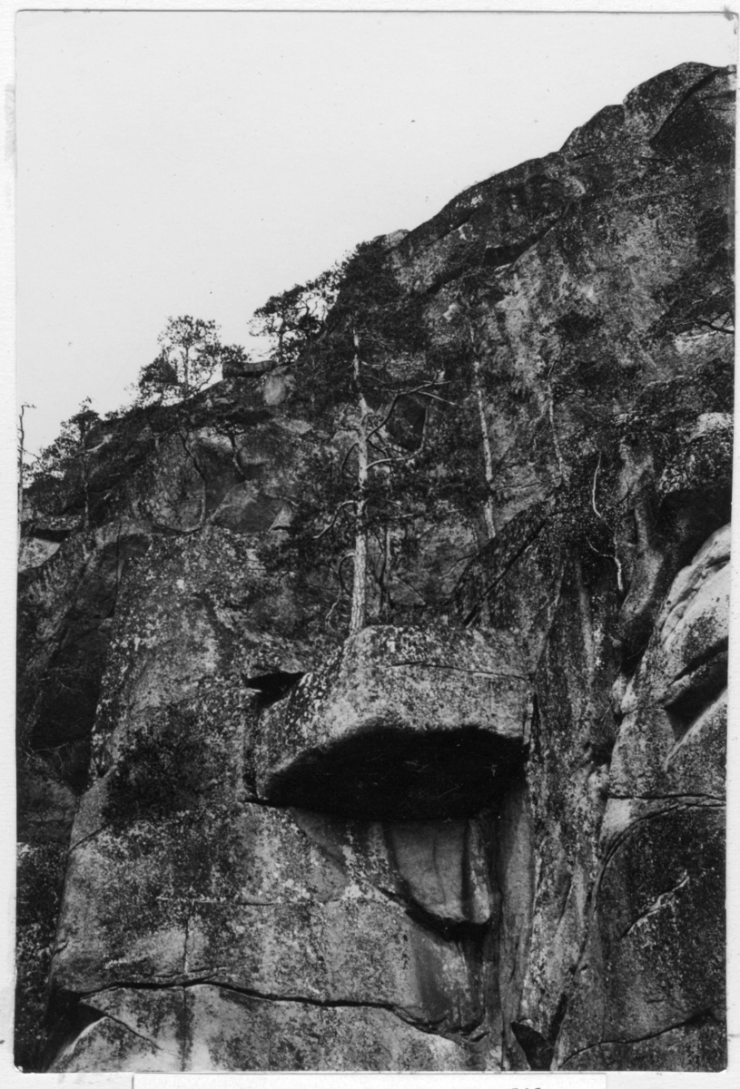 'Bildtext: ''Skogbeväxt bergvägg.'' Närbild på tall växande på klippavsats på bergvägg. :: :: Fotonr. 7046:1-84 indelade som ''Landskapsbilder från Göteborgs- och Bohus län.'' Ingår i serie med fotonr. 7046:1-383, 7047:1-33 och 7048:1-67 med bilder från Länsjägmästare John Lindners bildarkiv.'