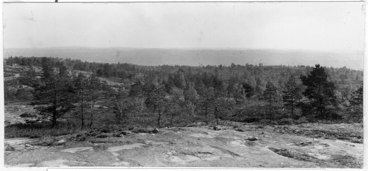 'Bildtext: ''Utsikt från Björnerödspiggen mot norr. 224 m.ö.h.'' Vy över berghällar med trädvegetation. :: :: Fotonr. 7046:1-84 indelade som ''Landskapsbilder från Göteborgs- och Bohus län.'' Ingår i serie med fotonr. 7046:1-383, 7047:1-33 och 7048:1-67 med bilder från Länsjägmästare John Lindners bildarkiv.'