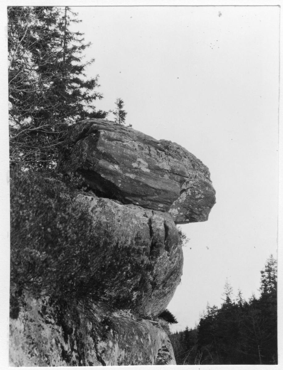 'Bildtext: ''Flyttblock.'' Stort stenblock liggande på berg. :: :: Fotonr. 7046:85-118 indelade som ''Geologiska bilder från Göteborgs- och Bohus län.'' Ingår i serie med fotonr. 7046:1-383, 7047:1-33 och 7048:1-67 med bilder från Länsjägmästare John Lindners bildarkiv.'